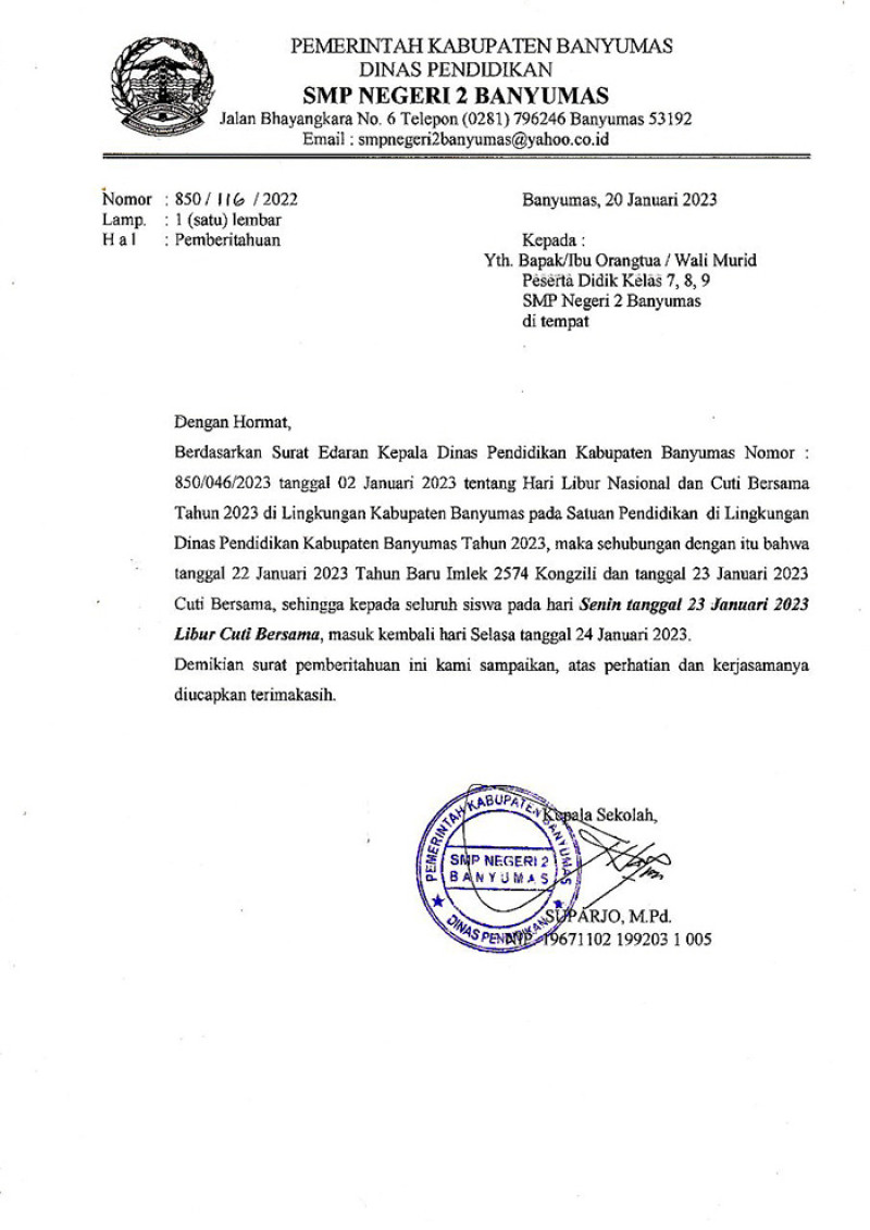 Selamat datang di Website SMP Negeri 2 Banyumas. Dengan perkembangan era globalisasi dan informasi yang  sangat pesat dan cepat maka kami berusaha memberikan layanan informasi dan komunikasi yang mudah, hemat, cepat dan bisa diakses setiap saat. Setelah mengalami masa pandemi masyarakat dituntut oleh kodrat alam, kodrat jaman dan kodrat keadaan untuk bisa menyesuaikan. Kondisi yang demikian memicu kami untuk berakselerasi mengikuti perkembangan jaman.
